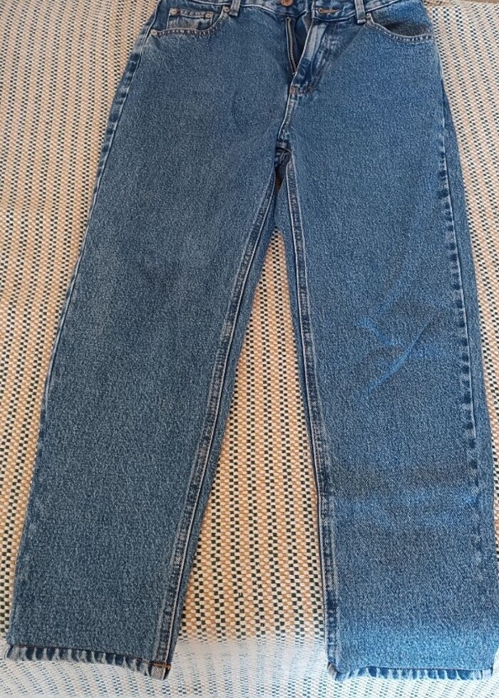 Sadece 1kez giyildi. 36 beden,ben 55 kilodayken almıştım bol gelmisti,belden pens attirdim,boyunu terzide yaptirdim.ama yeniden farksız,güzel bir Jean. yüksek bel..