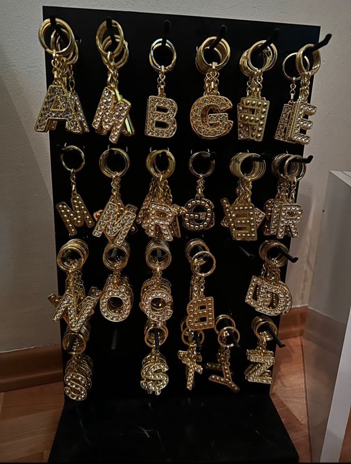 Pullu harf detaylı, parlak altın renkli, bohem tarzda kadın anahtarlık seti. ✨