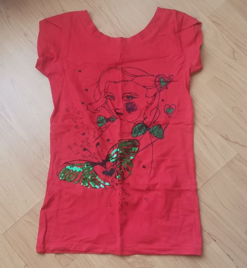 Pembe, kısa kollu, vücuda oturan kız çocuk tişörtü, renkli baskı ve pullu detaylarla pop kültür tarzını yansıtıyor.