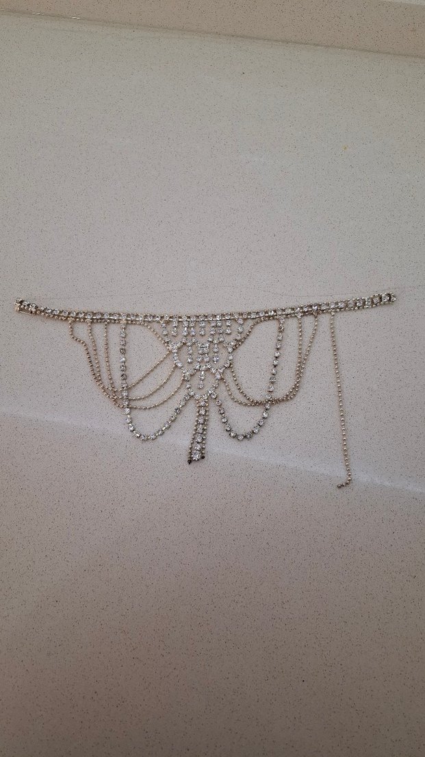 Beyaz renkte, pullu ve işlemeli desenli bu vücut zinciri, düğünler için uygun, bohem ve göz alıcı bir stile sahiptir.