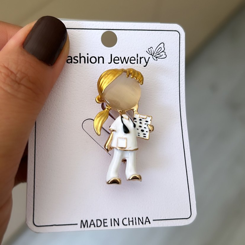 Ponytail saçlı kız figürlü, pullu ve baskılı beyaz broş, çağdaş ve modaya uygun tarz sunar. Çin'de üretilmiştir. ✨