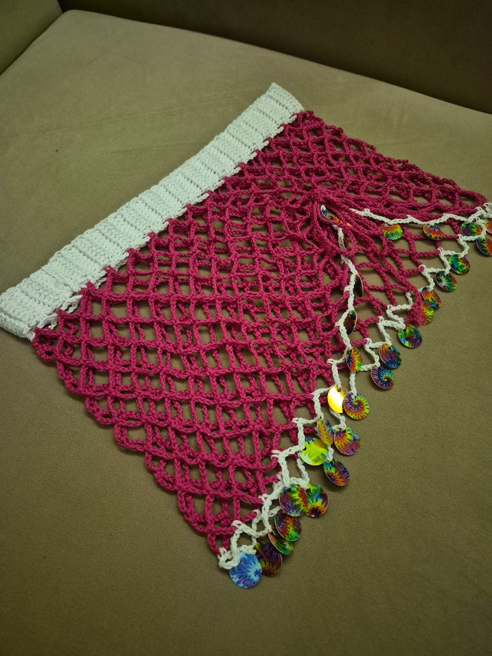Renkli örgü ağ tasarımlı, kenarları pul detaylı bohem tarzı kadın fuları. s / m uyumlu