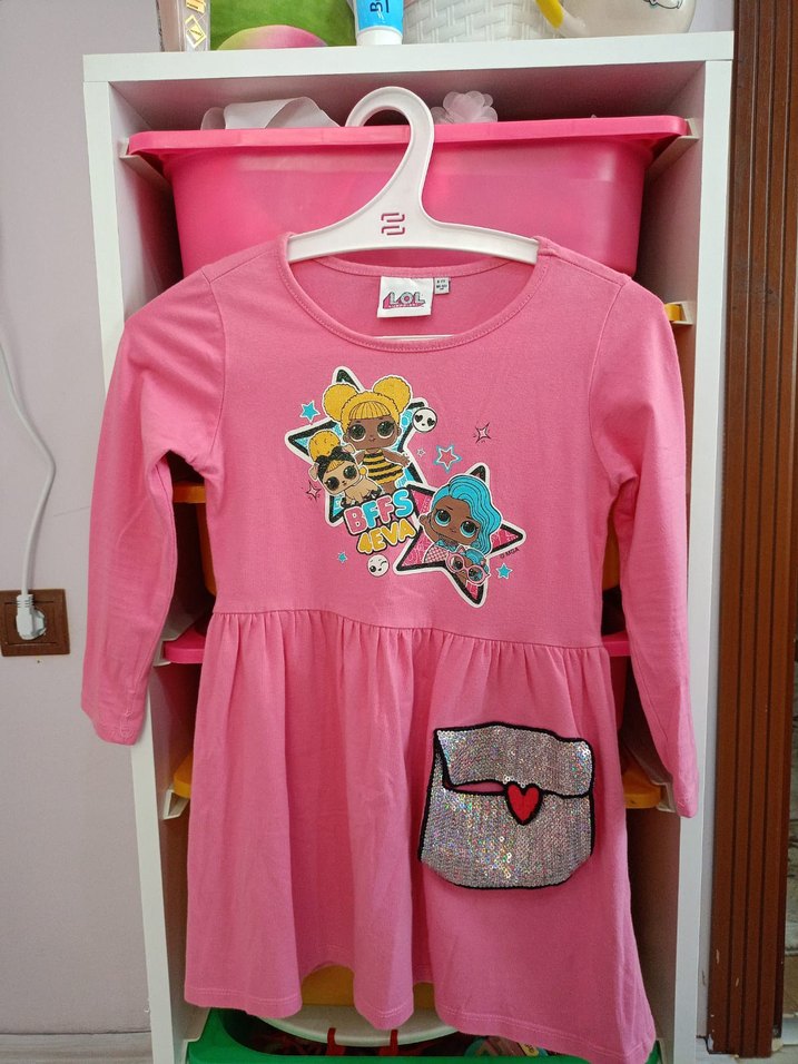 Pembe renkli kız elbisesi, uzun kollu ve bol kesimdir. Renkli baskılı figürler ve pullu parlak cep detayları vardır. Yuvarlak yakalı ve yumuşak sentetik kumaştan üretilmiştir.