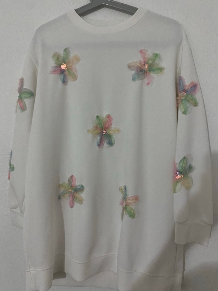 Uzun kollu, yuvarlak yaka, bol kesim beyaz sweatshirt. Pastel tonlarda tie-dye çiçek desenleri ve pullarla süslenmiştir. Günlük kullanıma uygun rahat bir model.