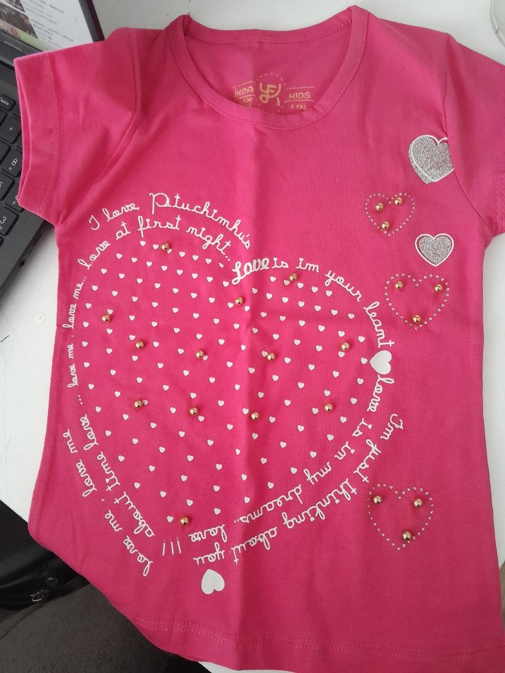 Kız çocukları için pamuk kumaştan, kısa kollu, bisiklet yakalı, pul işleme ve renkli baskılı kalp desenli dar kesim tişört. hic kullanılmadı hediye alinmisti vermeyi unuttum