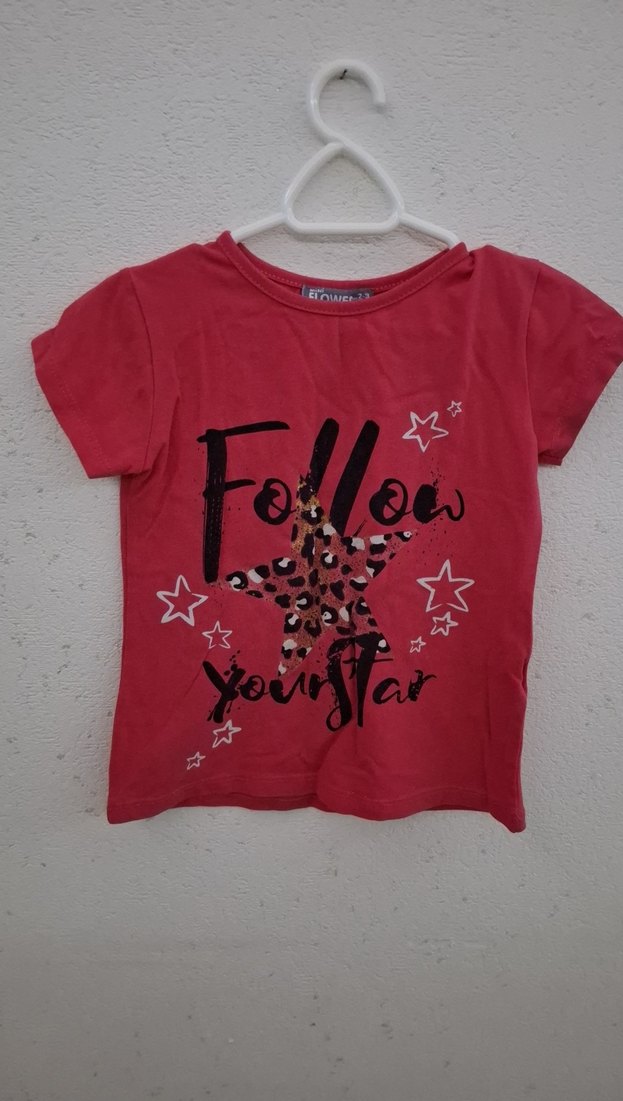 Pembe renkli, kısa kollu, yuvarlak yaka kız çocuk tişörtü. Renkli baskılı ve pullu detaylarla sokak tarzına uygun, rahat kesim.