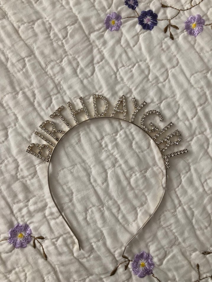 Pullu ve örgü görünümlü beyaz-gri 'BIRTHDAYGIRL' yazılı vintage bohem tarzda taç.