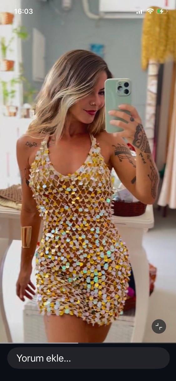 Pullu el örgüsü elbise Small Medium beden uyumlu mini yeni el örgüsüdir krem rengi Floş iplik üzerine parlak simli pullarla örülmüştür
