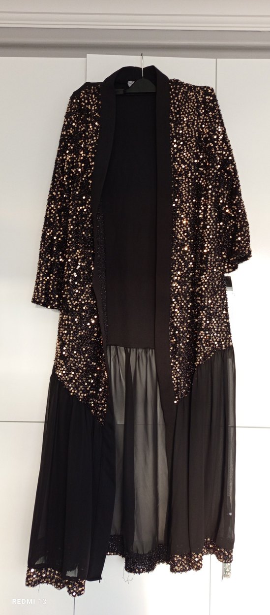 Drapeli uzun kollu, siyah ve desenli sentetik kumaştan yapılmış bol kesim uzun elbise, romantik akşamlar için uygundur. ✨kemeri yoktur