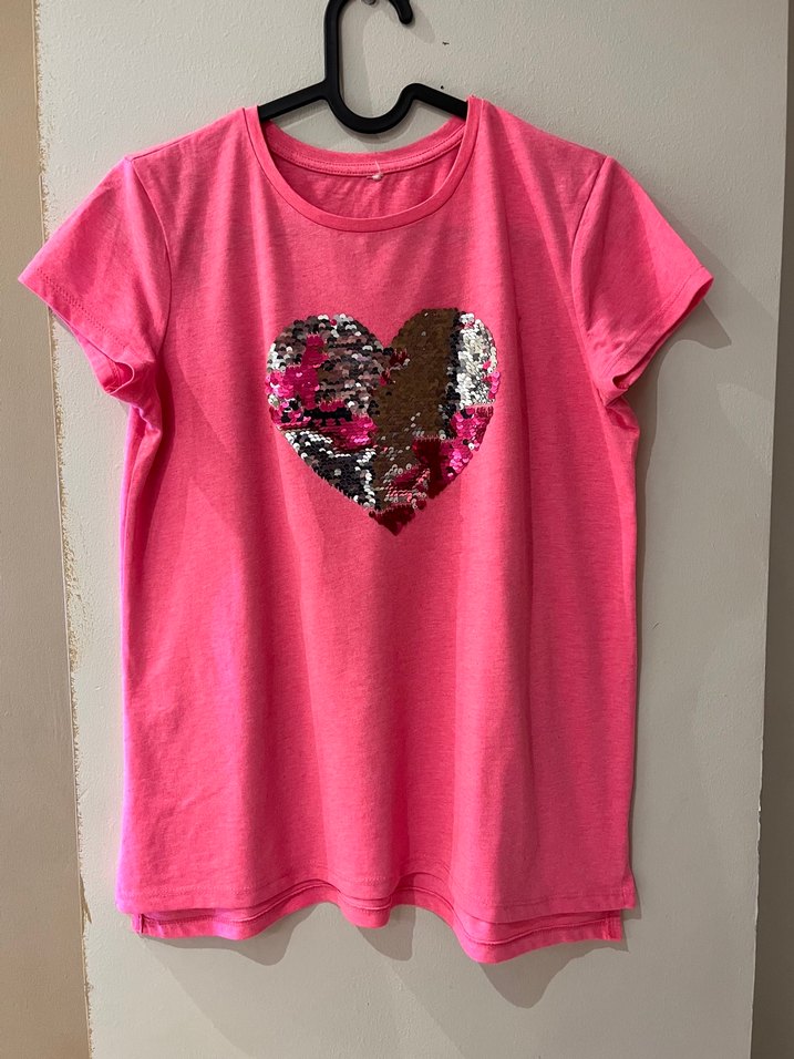 Kızlar için kısa kollu, bisiklet yaka ve bol kesim tişört. Pembe renkte, renkli pul işlemeli kalp deseni bulunur. Hafif ve yumuşak sentetik kumaştan üretilmiştir. 11-12 yaş bedendir
