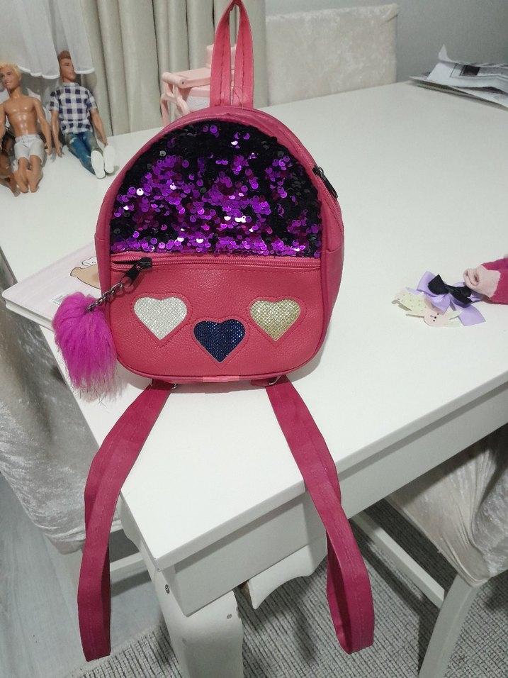 Pembe renkli kız çocuk sırt çantası, renkli pullu payetler ve kalp desenleriyle rock punk tarzını yansıtıyor. Üzerinde tüylü ponpon aksesuar bulunur.