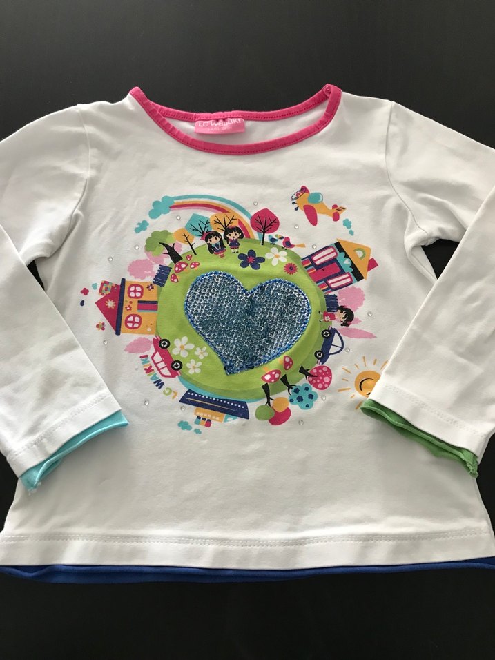 Renkli baskılı ve ortasında pullu kalp detayı bulunan kız çocuk uzun kollu tişört. Yuvarlak yaka ve bol kesimlidir, bohem ve retro tarzlara uygundur. Tertemiz yeniden farksız