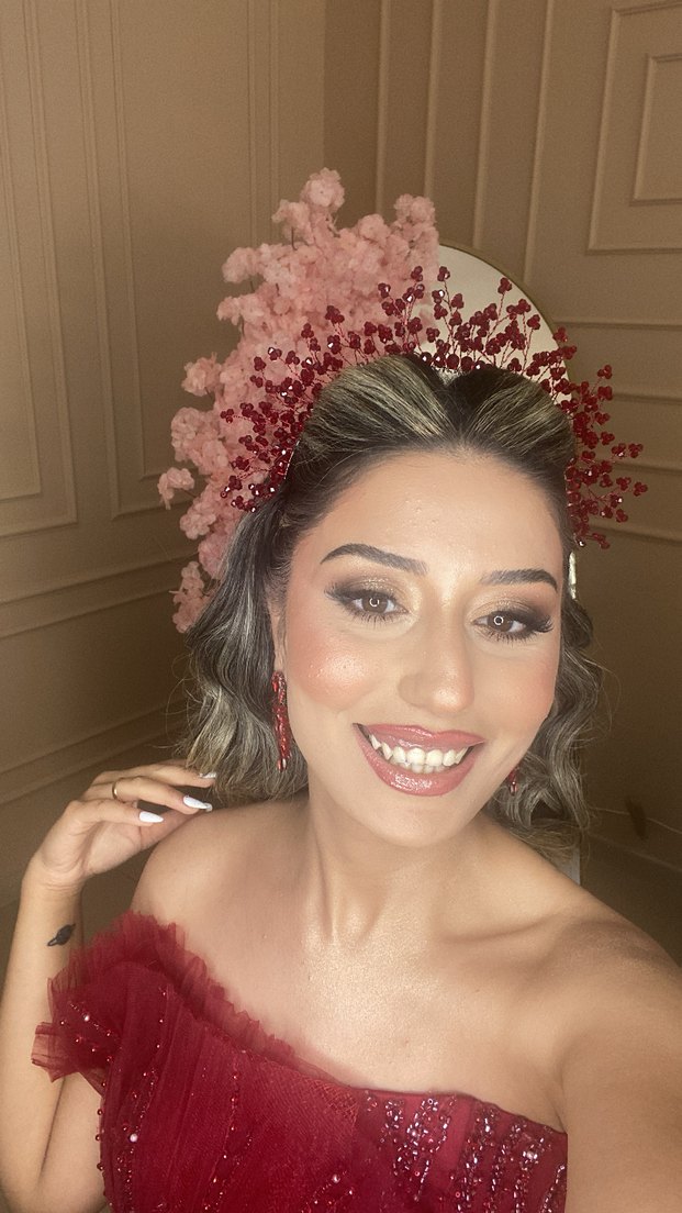 Hafif kırmızı bordo renkli, sentetik kumaştan yapılmış, pullu bohem tarz saç aksesuarı. Trend belirleyiciler için ideal. ✨