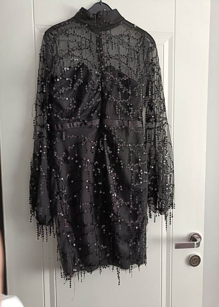 Diz üstü pul detaylı siyah abiye L-XL uyumlu