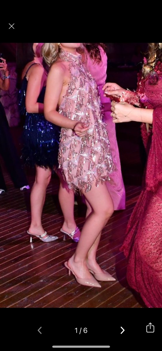 Pullu Mini Pembe Sırt dekolteli Kokteyl Elbisesi
