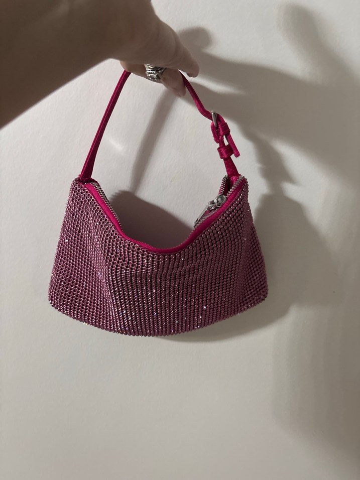 Pullu ve parlak pembe renkte, sentetik kumaştan yapılmış kadın omuz çantası, cesur sokak stili için uygun. ✨