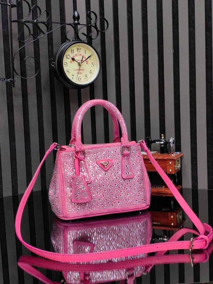 Canlı pembe deri ve pullu detaylara sahip çağdaş kadın çantası. Baskılı deseni ve cesur tasarımıyla parti için uygundur.