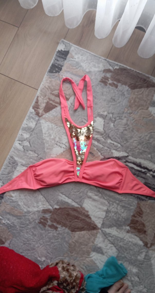 Pullu ve renkli desenli, ip askılı, pembe renkli, bohem tarzda, normal boyda ve dar kesim bikini üstü. Parti için uygun.