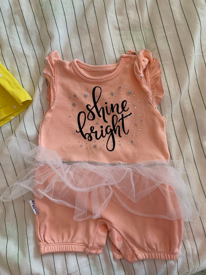 Kısa kollu, pul işlemeli 'shine bright' baskılı pembe kız bebek tulumu, yumuşak tül etek detayıyla. ✨ fisher price ve necix ürünleri adet fiyat 120 tl.