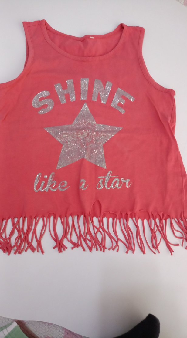 Püsküllü etek ucu ve parlak pul işlemeli baskılı, askısız yaka, bol kesim pembe kız çocuk atlet. Bohem tarzda. ✨