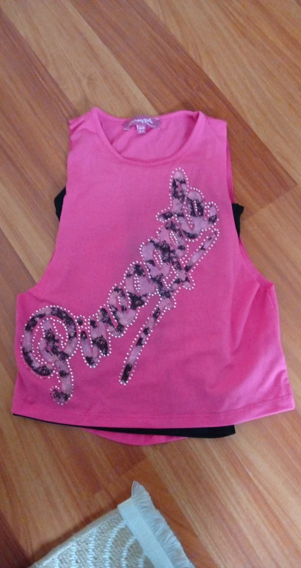Pembe renkte, pul işlemeli ve baskılı, kolsuz, fitted kesim kız yeleği. Sentetik kumaştan, rock punk tarzında ve straplez yaka ile dikkat çekiyor.