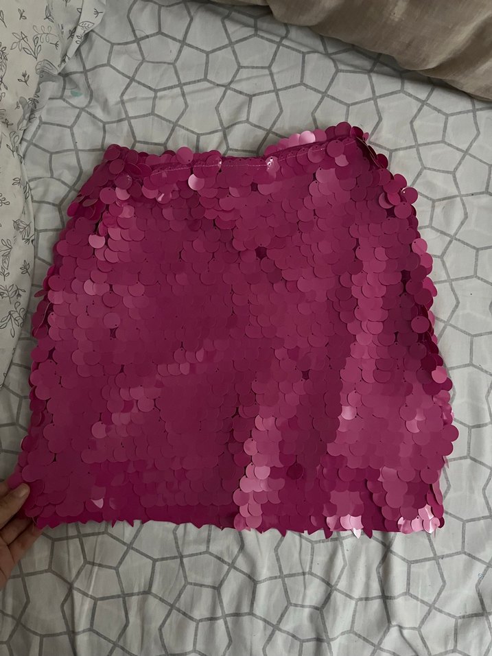 Sentetik kumaştan, pul işlemeli, pembemsi tonlarda, dar kesim mini etek. Parti için uygun, avangart tarzda. ✨