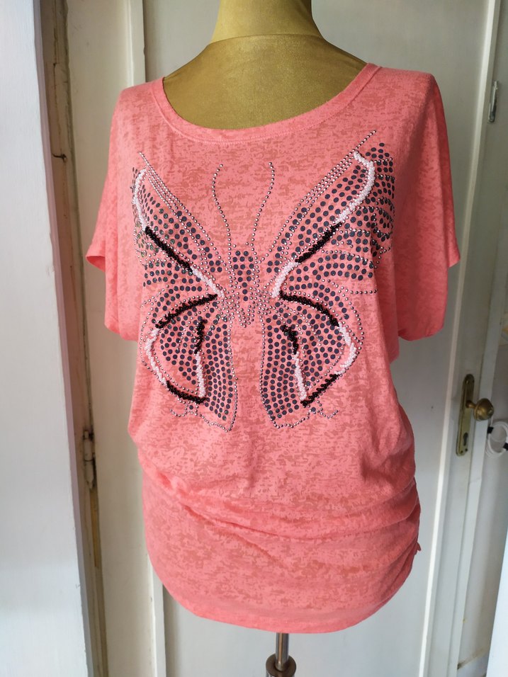 Pullu kelebek desenli, kısa kollu, yuvarlak yaka, bol kesim pembe tişört Yumuşak kumaştan, günlük rahat kullanıma uygun. marka temsilidir