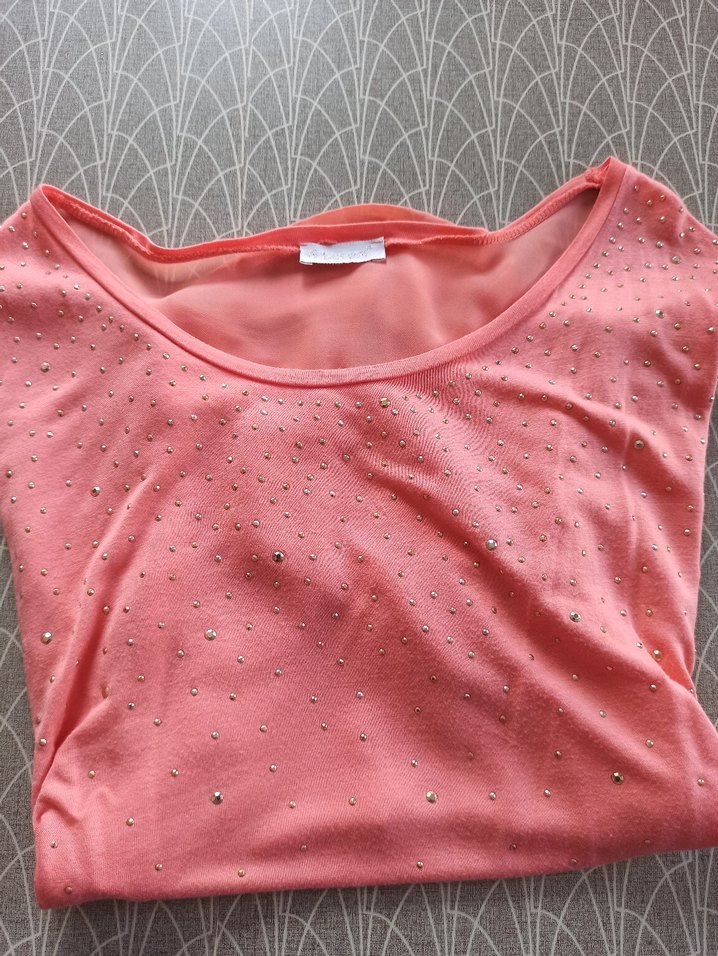 Pembe, kısa kollu tişört yuvarlak yakalı ve rahat kesimdir. Parlak pullarla süslenmiş yumuşak sentetik kumaştan yapılmıştır.