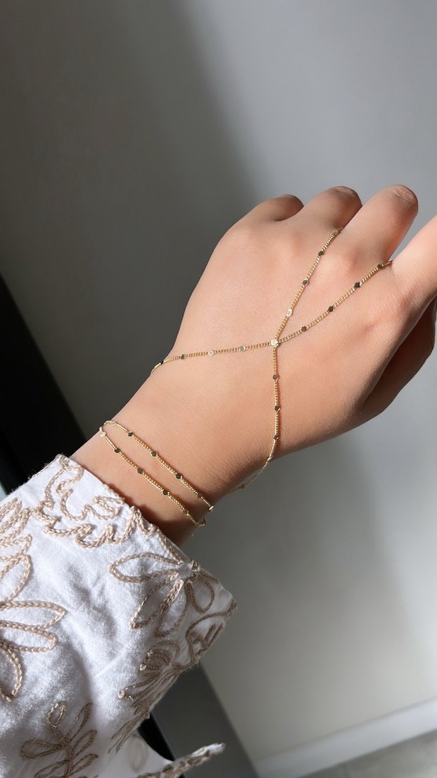Altın renkli zincir detaylarıyla sade ve bohem tarzda kadın el zinciri, günlük kullanıma uygun. ✨