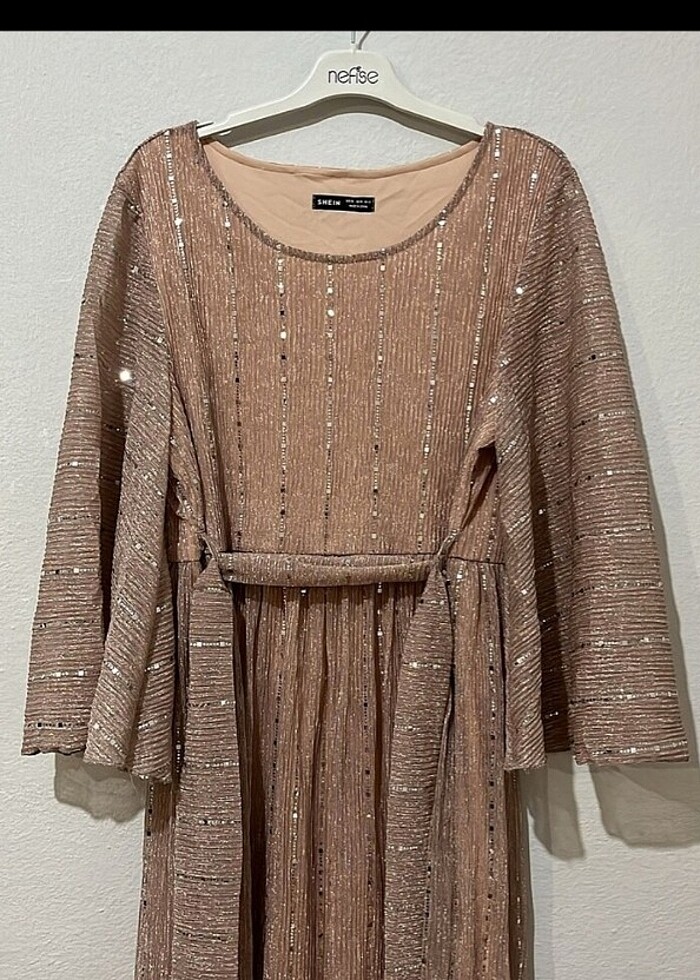 Pullu uzun boy belden lastikli,kemerli gösterişli elbise.Gül detaylı kemeri boynunuzda da kullanabilirsiniz.Aşırı rahat bir elbise hamile abiyesi olarak da çok rahat kullanılabilir. 42,44 beden uyumludur.