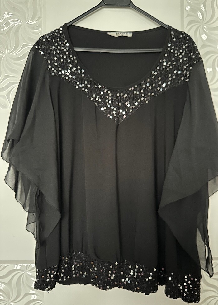 Kısa şifon kollu önü hafif derin yuvarlak yaka Yaka ve etek uçları pul işlemeli Ayrıca etek ucu hafif lastikli şık bluz 46-50 beden aralığı tercih edebilir En 63 cm Boy 70 cm