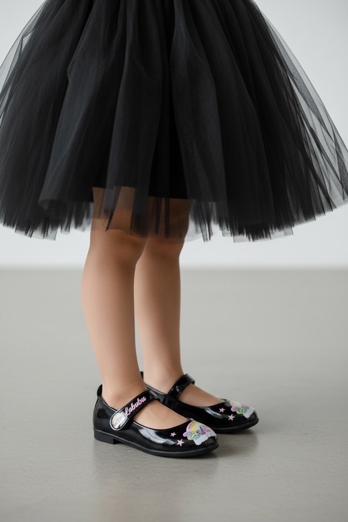 Pullu Siyah Bağcıklı Kız Babet
