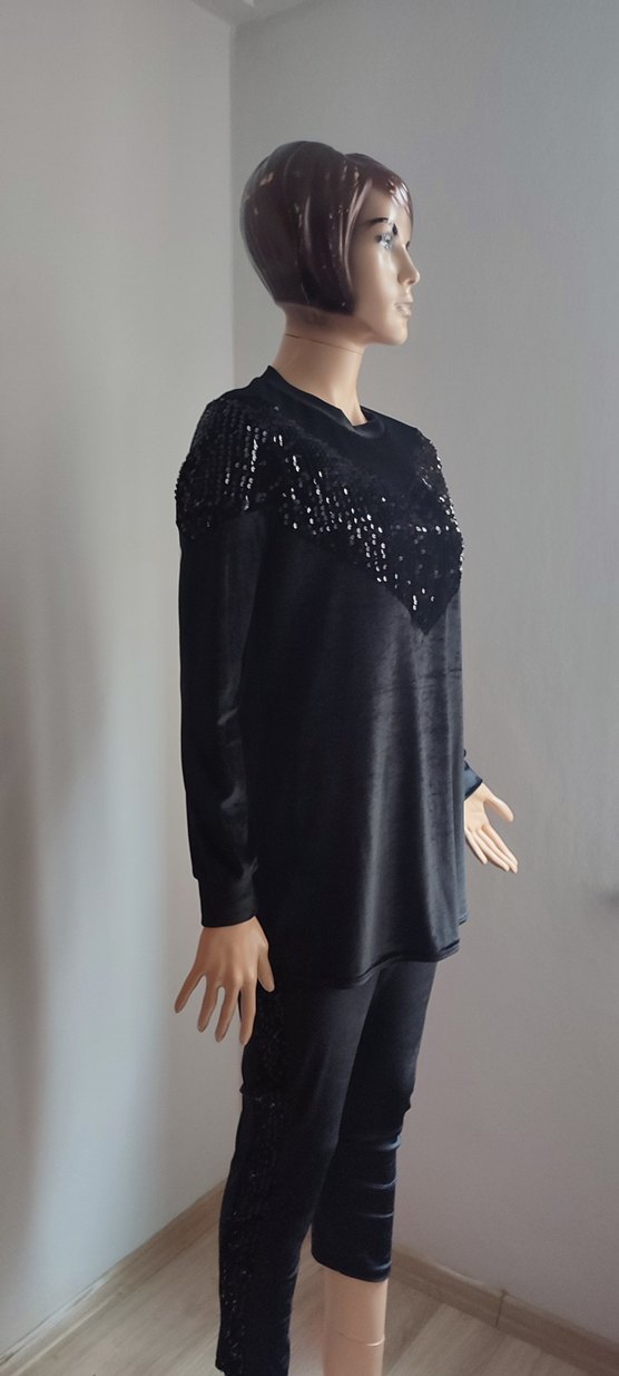 Pul işlemeli, uzun kollu siyah tunik, bol kesim ve yuvarlak yakaya sahiptir. Sentetik kumaştan yapılmıştır ve günlük kullanıma uygundur.