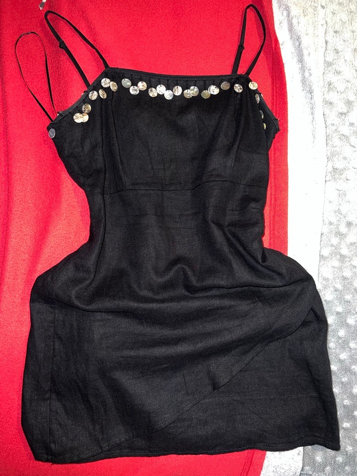 siyah pullu mini işlemeli detaylara sahip. Parti için uygun şık ve fit kesim elbise.