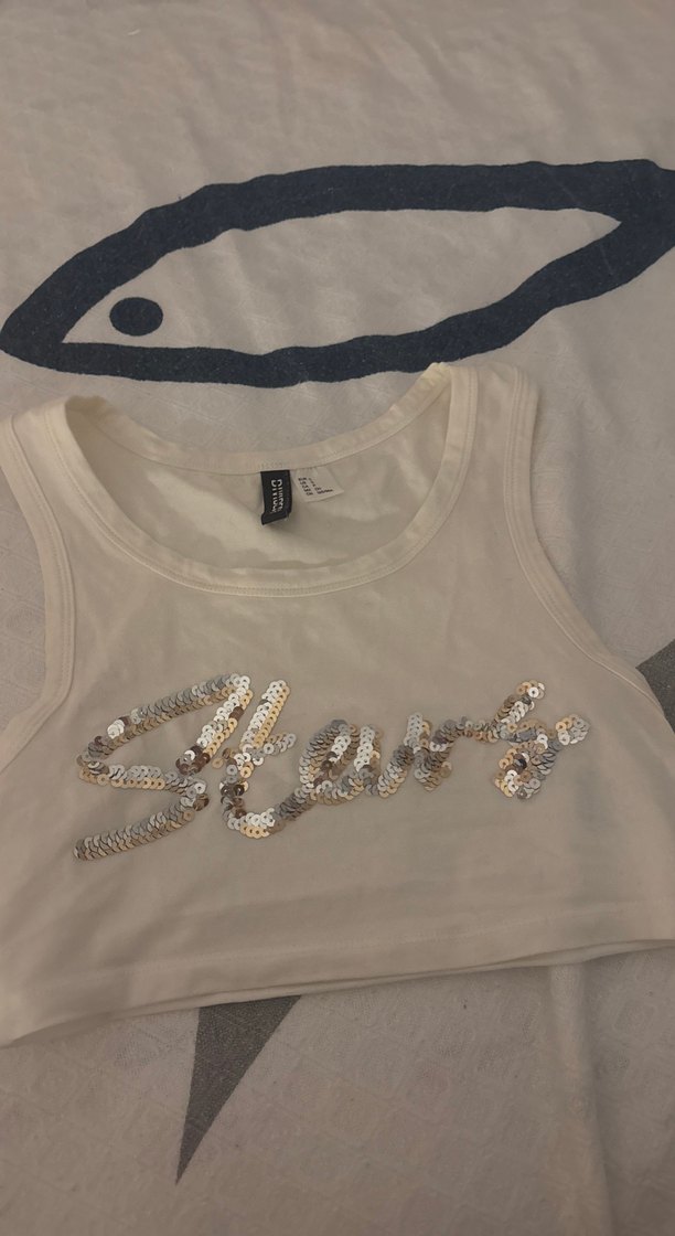 Beyaz, payetli baskılı, kısa ve dar kesim mini atlet. Yumuşak sentetik kumaştan, günlük ve sokak modasına uygun. ✨Cok az kullandim