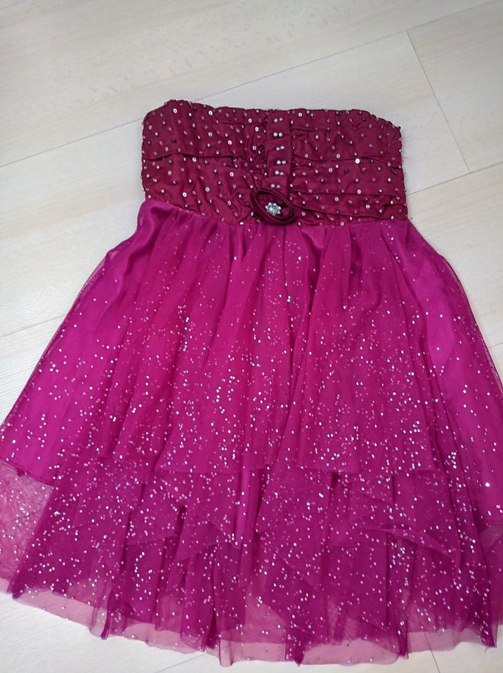 Pullu, straplez, midi boyda, kolsuz, pembe abiye elbise, şık ve göz alıcıdır.