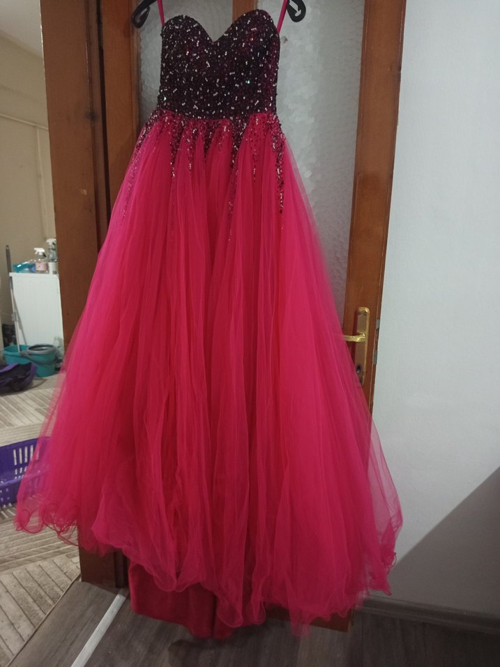 Pullu, straplez ve taşlı üst kısmı olan bu uzun pembe elbise, fitted kesimi ve askılı kollarıyla dikkat çeker. Nişan ve özel davetler için uygundur. elbise yeni dikildi hiç giyilmedi fiyat konuşulur gene de