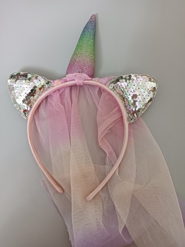 Pembe pastel tonlarda, pullu kulakları ve gökkuşağı boynuzu olan unicorn taç, tie-dye desenli tül detaylıdır. ✨