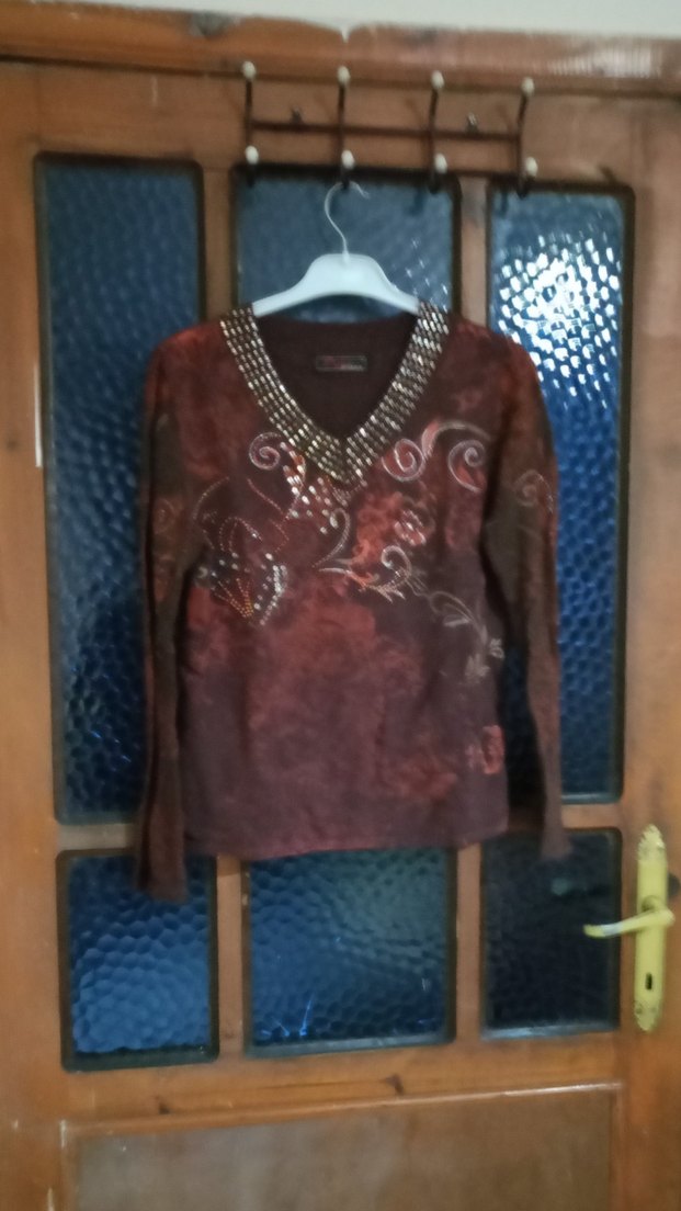 Uzun kollu, V yakalı, koyu kahverengi batik desenli ve pul detaylı bol kesim bohem bluz.