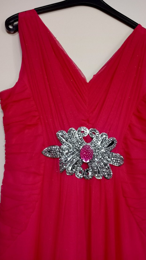 Uzun, v yaka ve kolsuz kesimiyle pul işlemeli ve baskılı desenli pembe abiye elbise. Düğünler ve modaya uygun etkinlikler için ideal. ✨40 bedene uygundur,Alana şimdiden hayırlı olsun