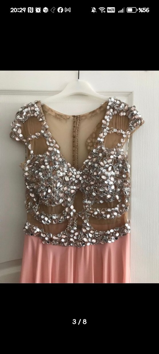 Pullu ve V yakalı, kolsuz, pembe uzun abiye elbise. Gövdesi parlak pullarla süslenmiş, şık ve çağdaş tasarım.