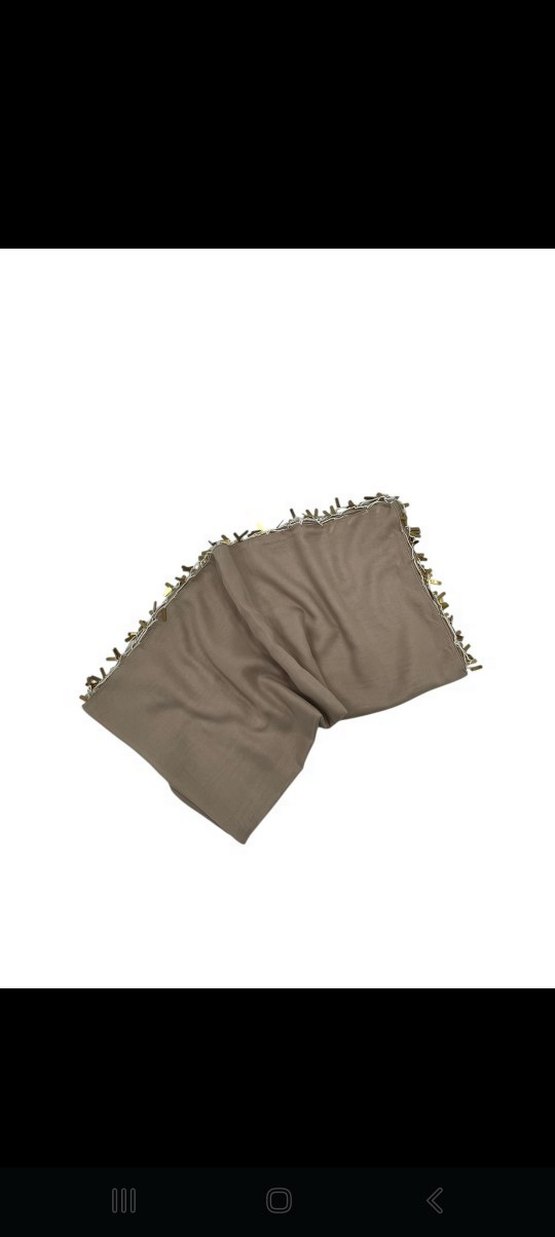 Yumuşak dokulu bej kadın yazma kenarlarında püskül detaylarıyla rahat ve sade bir görünüm sunar. Günlük kullanıma uygundur.
