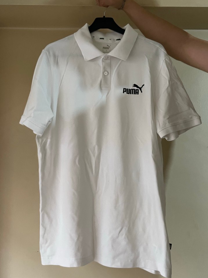 Pamuk kumaştan beyaz, kısa kollu, yakalı ve düğmeli Puma baskılı erkek polo tişört. Spor ve günlük şıklık için uygun, dar kesim.