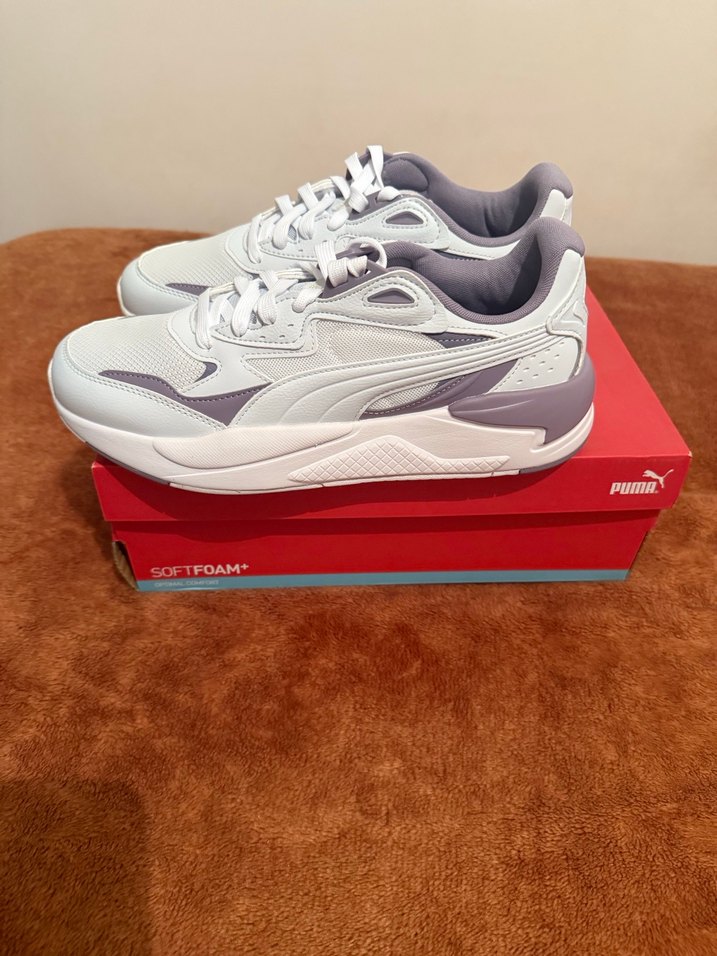 Puma markalı beyaz ve gri renklerde, platform topuklu ve kabartmalı tasarıma sahip spor ayakkabılar. Kauçuk tabanlı, sokak stili ve spor giyime uygun. ♀️