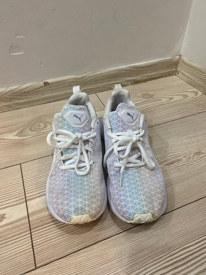 Puma markalı, beyaz tabanlı, pastel tie-dye desenli, bağcıklı kadın spor ayakkabısı. Sokak stili ve spor için uygundur. ayağıma küçük geldiği için iki üç kez giydim uzun zamandır dolapta duruyor hiçbir kusuru yok