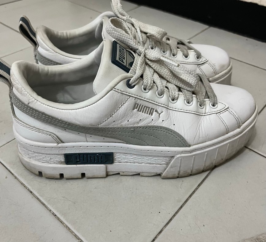Puma markalı beyaz ve gri renklerde, platform topuklu spor ayakkabılar, rahat sokak stili için uygundur.