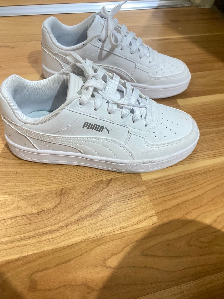 Beyaz Puma spor ayakkabılar, platform topuk ve sade desensiz tasarıma sahiptir. Kauçuk tabanlı, spor ve günlük kullanım için rahat şıklık sunar. 2 kez giydim ayağımda aşırı şişlik ve ödemden dolayı satıyorum orjinal ürün uyguna vericem