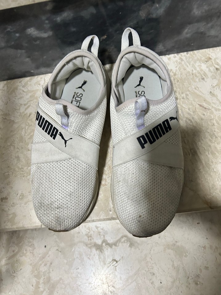 Puma marka beyaz ve gri renkli, lastik tabanlı, cırt cırtlı kadın spor sneakers. Spor ve günlük sokak stiline uygun. Yıkansa lekeler gider