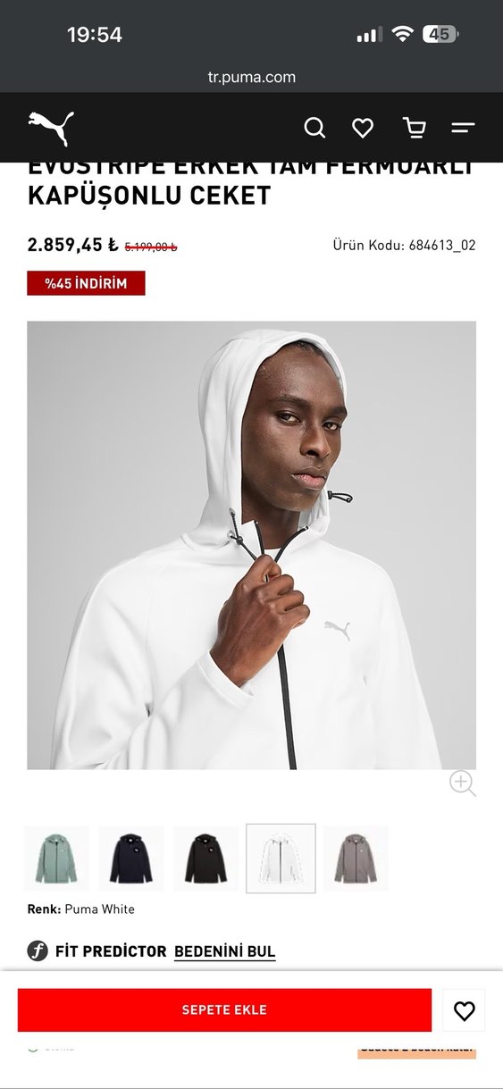 Sıfır Puma sitesinde indirimli fiyatı bile 2900 sıfırdır etiketi yoktur ilgilenenler pumanın sitesinden bakabilir Beyaz kapüşonlu sweatshirt, fermuarlı ve fitted kesimdir. Yumuşak fleece kumaştan yapılmış, günlük rahat kullanım için uygundur.