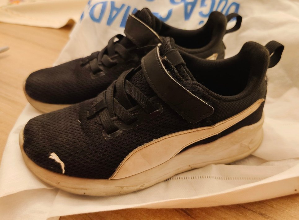 Puma marka, siyah renkli, Velcro bantlı erkek çocuk spor ayakkabı. Kauçuk tabanlı, rahat ve trend sokak stili ayakkabı. Hiçbir deformesi yok. Tabanı rahat ayakkabı